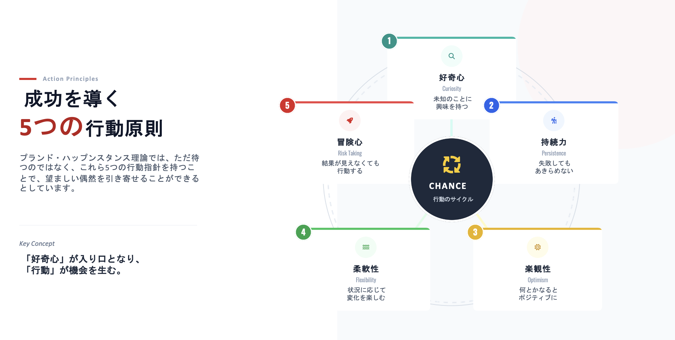 プランド・ハプスタンス理論は、私たちが日々の行動や節目作り、チャンス作りにおいて持つべき行動原則を提唱しています。それは、好奇心、持続力、楽観性、チャレンジ、柔軟性の5つです。この5つの原則を実践することで、自分の未来を変えられます。