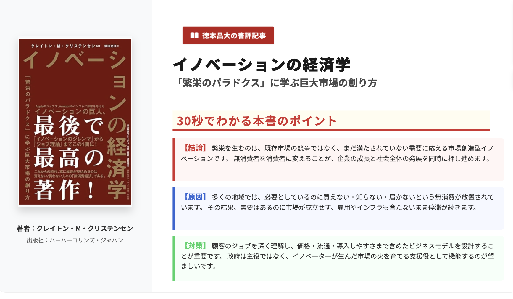 【結論】 繁栄を生むのは、既存市場の競争ではなく、まだ満たされていない需要に応える市場創造型イノベーションです。 無消費者を消費者に変えることが、企業の成長と社会全体の発展を同時に押し進めます。