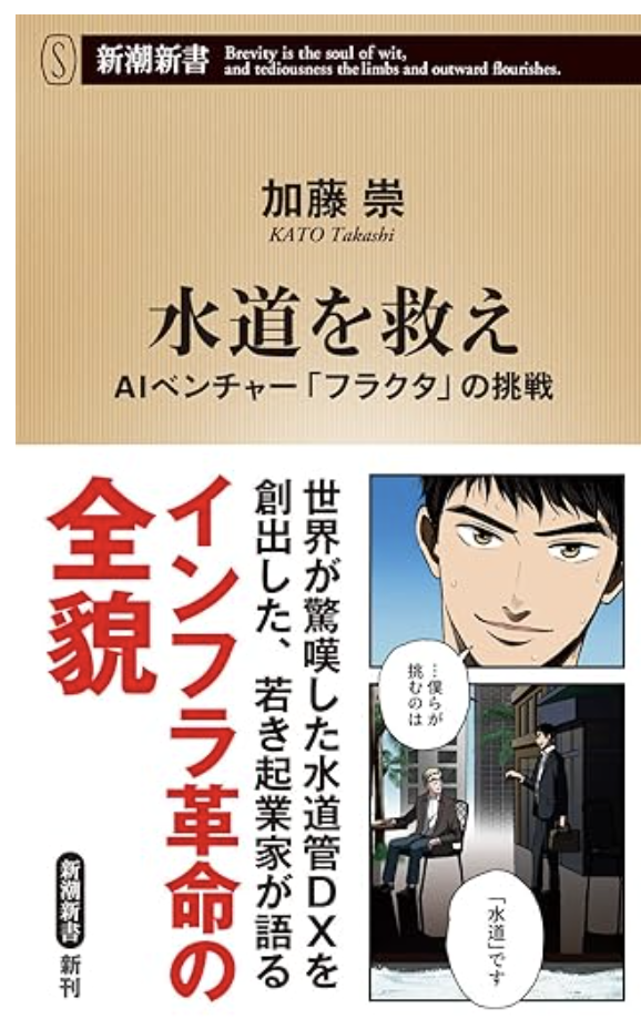 私はその実態と解決策を知るために、水道を救えという書籍を手に取りました。本書は、水道インフラが直面する問題と、それに挑むAIベンチャー「フラクタ」の取り組みを描いた一冊です。著者の加藤崇氏は、かつて自身のロボットベンチャーをGoogleに売却した実績を持ち、現在は水道インフラの未来に挑む異色の起業家として知られています。