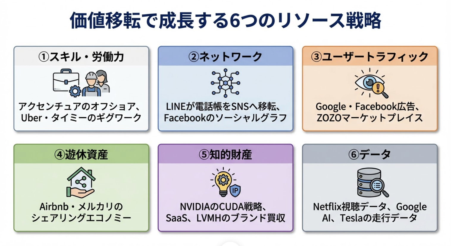6つのリソース──スキル、ネットワーク、トラフィック、遊休資産、知的財産、データとAI──を通じて、Google、LINE、NVIDIA、Netflix、Teslaは、外部経済から内部経済へと価値を移転し、圧倒的な成長を遂げました。