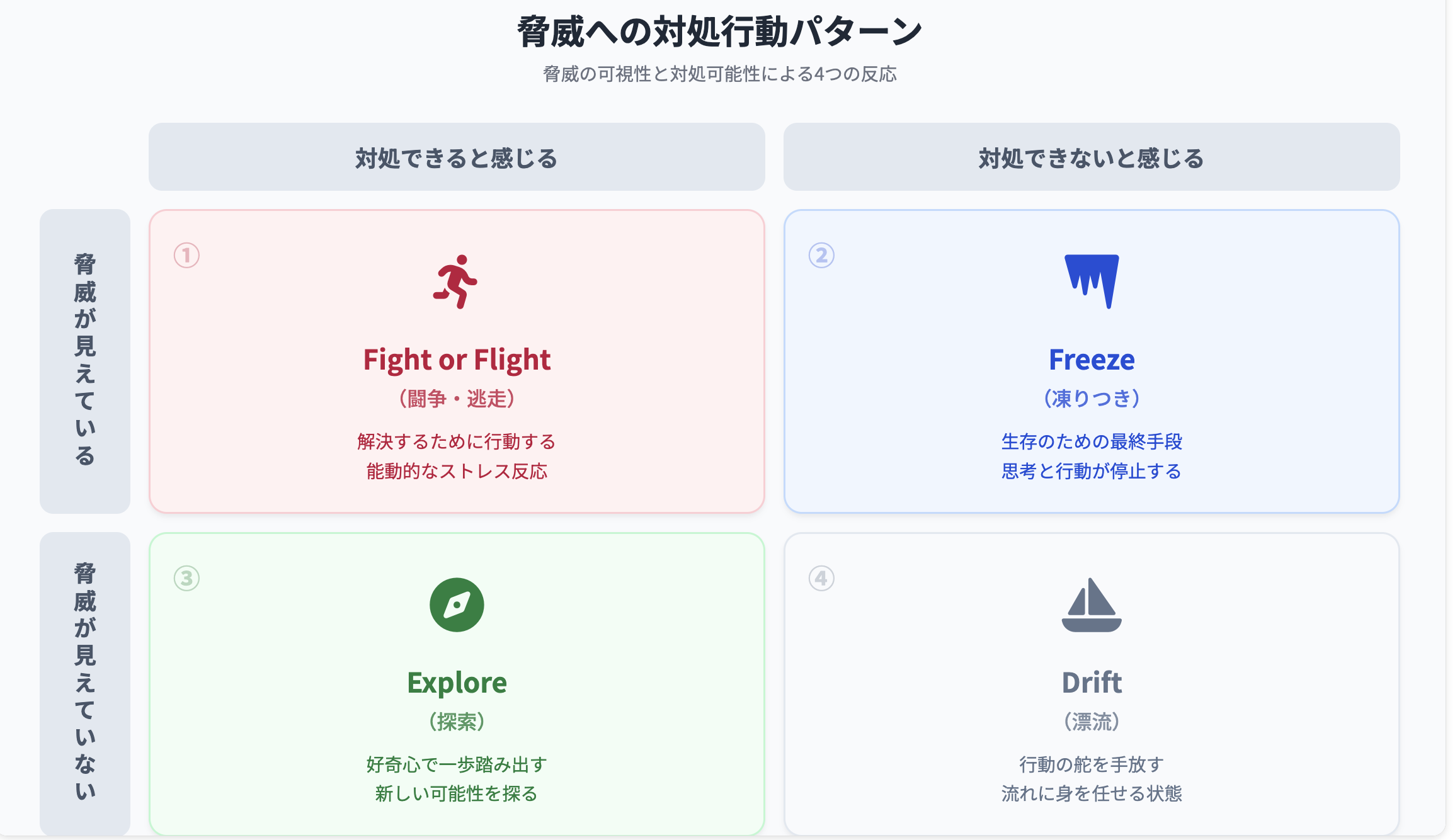 著者は、脅威(脅威)に対する「視認性」と「対処」の2軸から、人間のストレス反応を4つのパターンに分類しています。これは、お金の不安に対する私たちの無意識の反応パターンを理解するために極めて有用です。