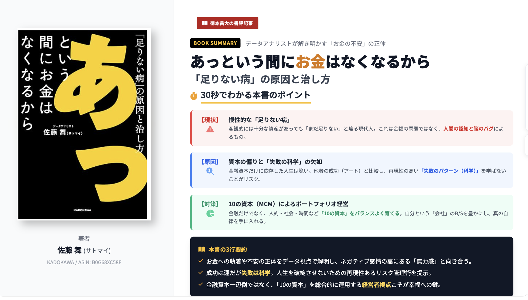 本書は、お金への執着や不安の正体をデータサイエンスの視点で解明し、ネガティブ感情の裏にある「無力感」と向き合うことの重要性を説く。成功は運(アート)だが失敗は科学であるという前提に立ち、人生を破綻させないための再現性あるリスク管理術を提示している。金融資本一辺倒ではなく、人的・社会・時間などを含む「10の資本」を総合的に運用する経営者視点こそが、持続可能な幸福への鍵であると主張する。