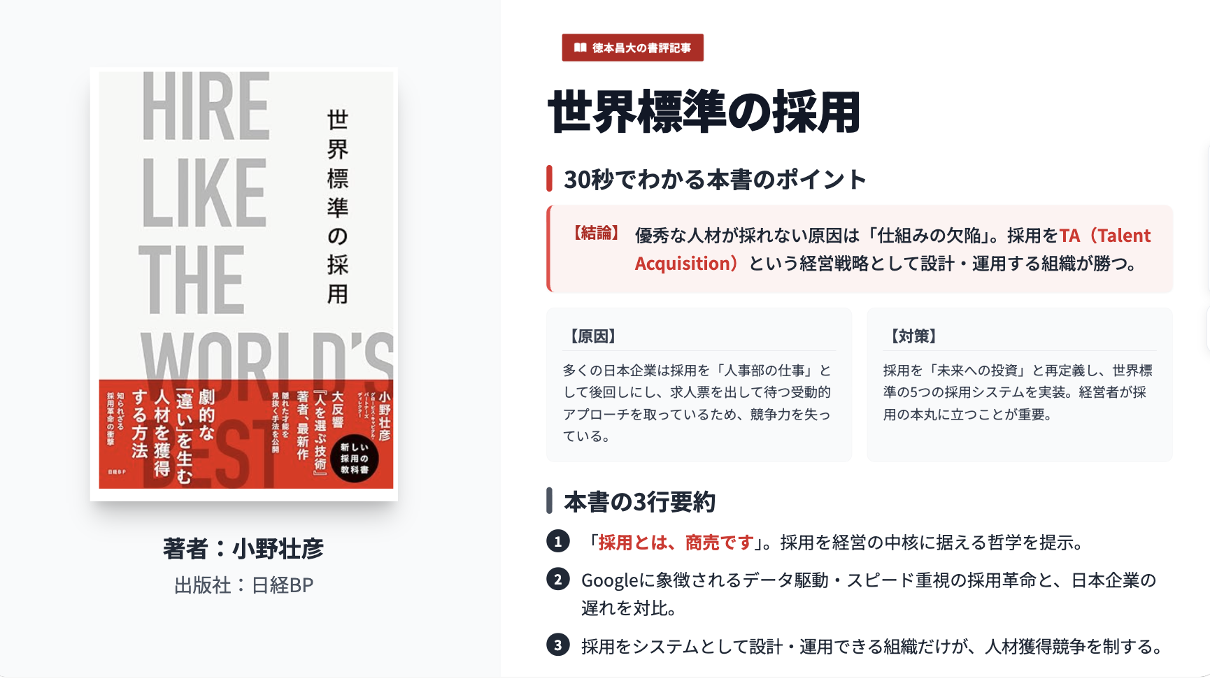 「世界標準」の採用を学ぶことは、採用だけを学ぶことではありません。経営の在り方、人材との向き合い方、そして「仲間と共に未来の利を育む」というビジネスの根源的な問いと、正面から向き合うことです。 すべての経営者とビジネスリーダーの方に、今すぐ手に取ることを強くお勧めしたい一冊です。