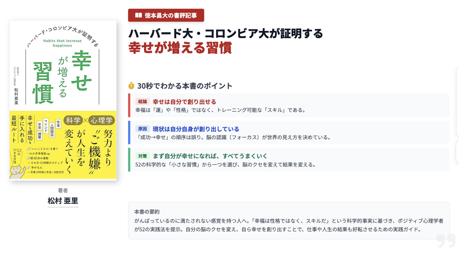 現代社会において、懸命に働きながらも拭いきれない「満たされなさ」を感じるビジネスパーソンは少なくありません。医学博士であり、ポジティブ心理学者の松村亜里氏のハーバード大・コロンビア大が証明する幸せが増える習慣は、この正体不明の違和感に対し、ポジティブ心理学の科学的エビデンスを基に明確な解を提示する一冊です。