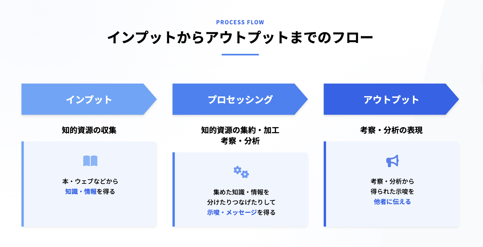 最後にアウトプットは、考察・分析の表現です。プロセッシングから得られた示唆を他者に伝える段階であり、文章・会話・資料など形は問いません。重要なのは、アウトプットがゴールではなく、プロセッシングのクオリティを検証する役割を担っています。