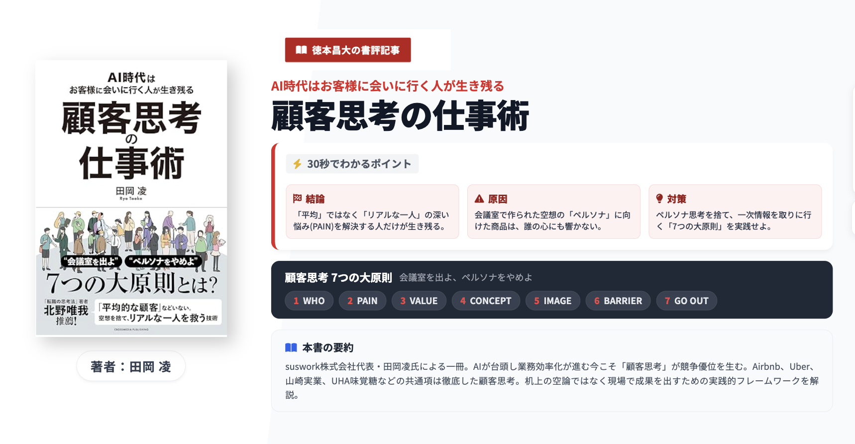 【原因】:多くの企業や個人は、会議室の中で作られた「ペルソナ」という空想の顧客に向けた商品開発やマーケティングを行っており、結果として誰の心にも響かない「Better(少し良い)」止まりの提案しかできていない。 【対策】:ペルソナ思考を捨て、「WHO(顧客からはじめよ)」「GO OUT(顧客に会え)」などからなる「顧客思考 7つの大原則」を実践すること。一次情報を取りに行く泥臭い行動こそが、AIには代替できない最大の武器となる。