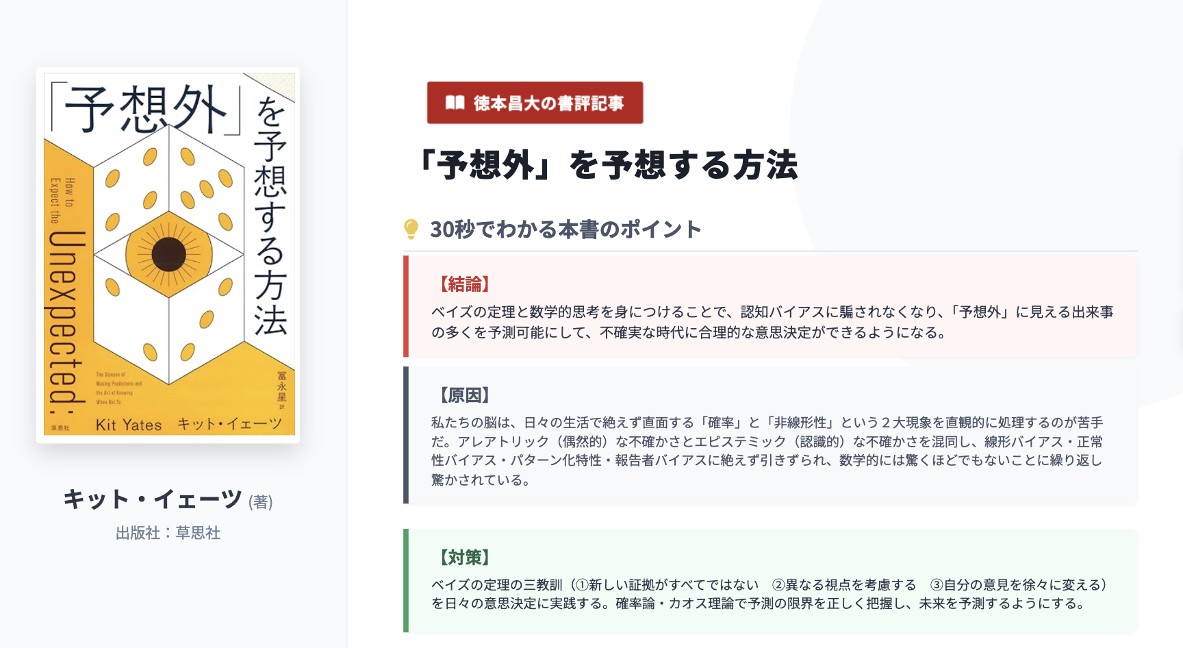 【結果】:ベイズの定理と数学的思考を身につけることで、認知バイアスに騙されなくなり、「予想外」に見える出来事の多くを予測可能にして、不確実な時代に合理的な意思決定ができるようになる。