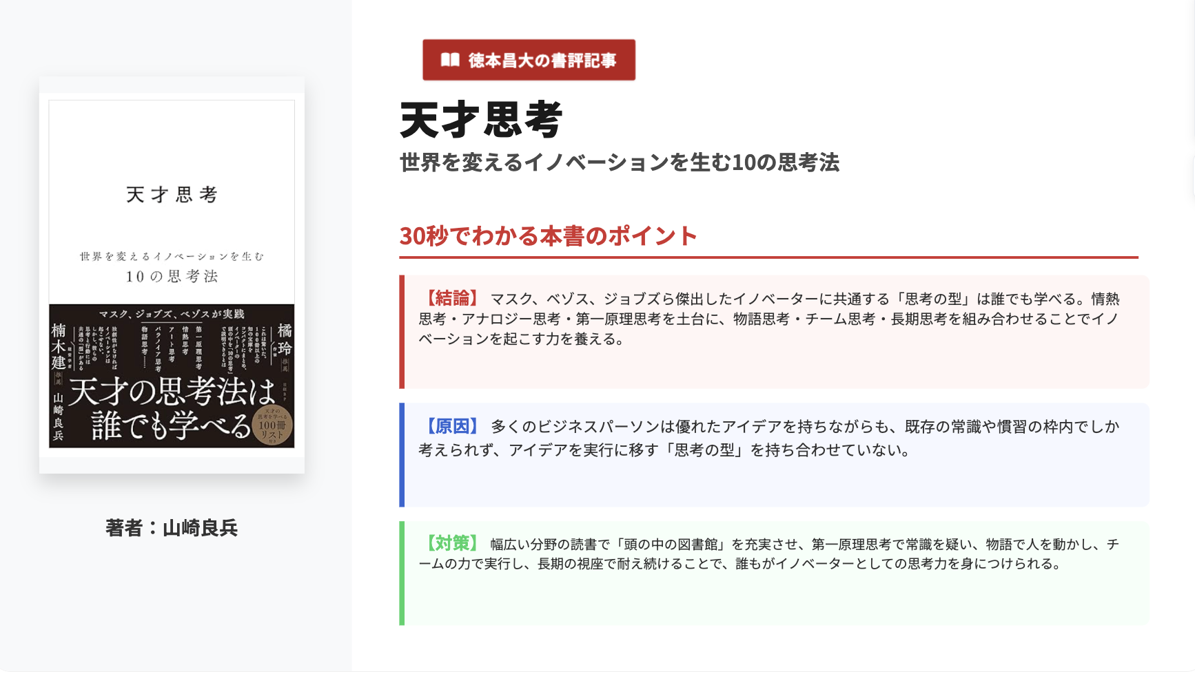 私は大学でフレームワーク思考やイノベーション理論を教えており、このブログでもマスク、ベゾス、ジョブズをはじめ多くのイノベーターに関する書籍を紹介してきました。個々の本からも学ぶことは多いのですが、本書『天才思考』はそれらに通底する共通点を10の思考法として体系化し、非常にわかりやすくまとめてくれています。