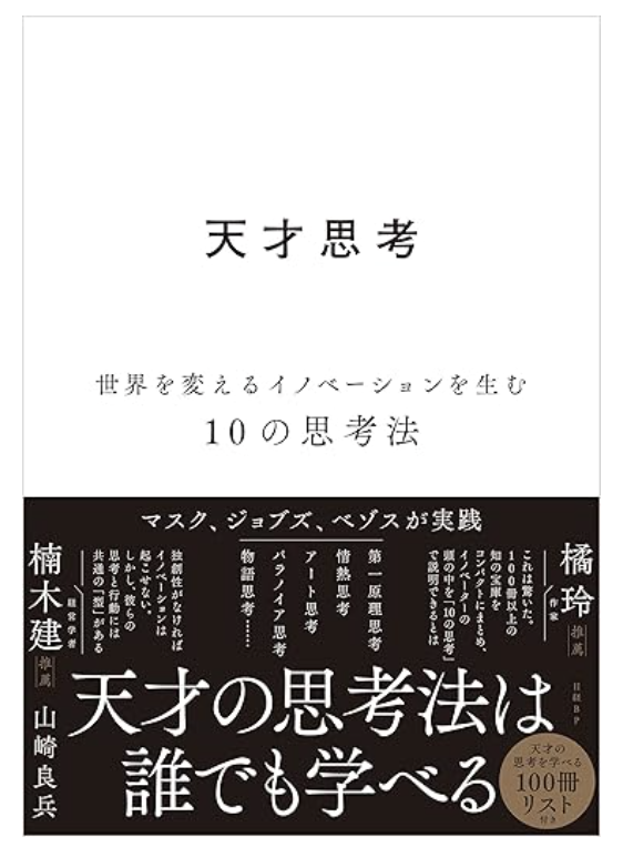 本書『天才思考』は、日経ビジネスの記者としてマスク、ベゾス、ビル・ゲイツの3人を直接インタビューした山崎良兵氏が、100冊以上の書籍と論文、そして自身の取材経験を照らし合わせながら、傑出したイノベーターに共通する10の思考法を体系化した一冊です。情熱思考、第一原理思考、アナロジー思考、パラノイア思考、物語思考、反逆思考、情熱思考、SF思考、チーム思考、アート思考などイノベーションを起こすための「思考の型」を体系的に解説しています。