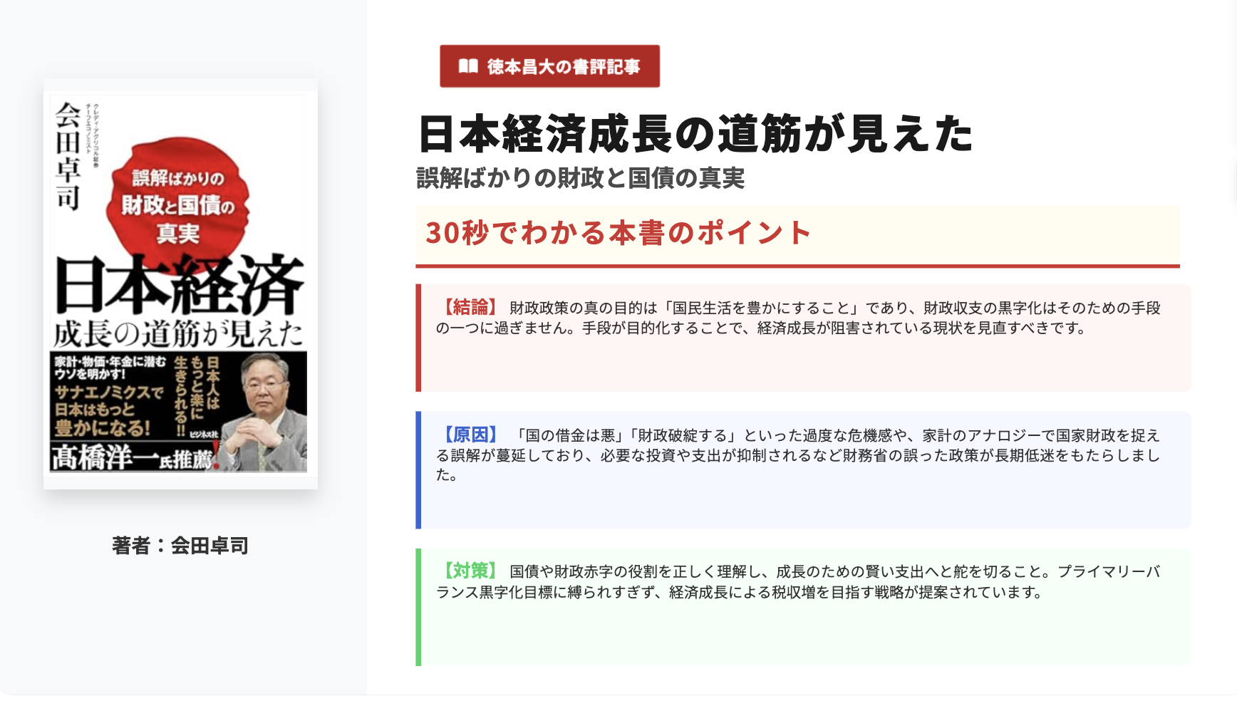 会田氏はクレディ・アグリコル証券のチーフエコノミストとして、長年マクロ経済分析の最前線に立ってきた人物であり、本書ではその知見をもとに、「財政健全化至上主義」がいかに日本経済を蝕んできたかを冷静かつ論理的に解き明かしています。