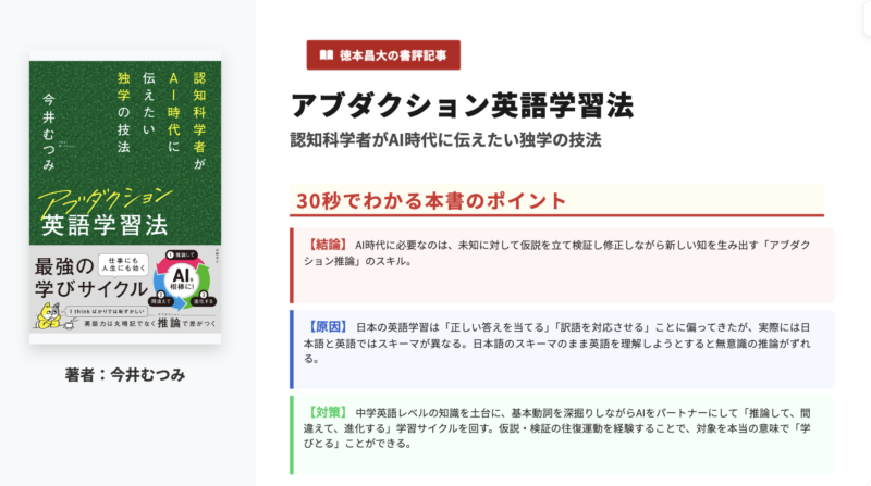『アブダクション英語学習法』が提供するのは、単なる英語学習のメソッドではなく「知識を自ら習得する技術」です。 暗記を増やしても、状況が変われば太刀打ちできません。しかし、「未知の状況で仮説を立て、試し、修正して最適化する」という学びの型を一度身につければ、それは英語のみならず、仕事や人生のあらゆる課題を突破する武器になります。
