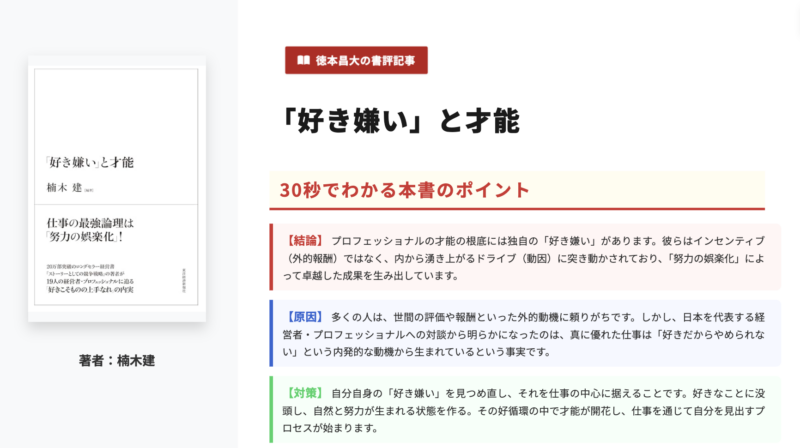 しかも本書は、単なる「好きなことをやればいい」という自己啓発本ではありません。仕事とは、自分以外の誰か、すなわちお客のためにやるものです。アウトプットのうち「成果」と呼べるのは、お客が評価し、受け入れ、対価を払ってくれるものだけです。 この厳しさを前提にした上で、なお高い成果を出し続ける人たちは、努力を苦役としてではなく、娯楽のように没頭している。そこに本書の核心があります。