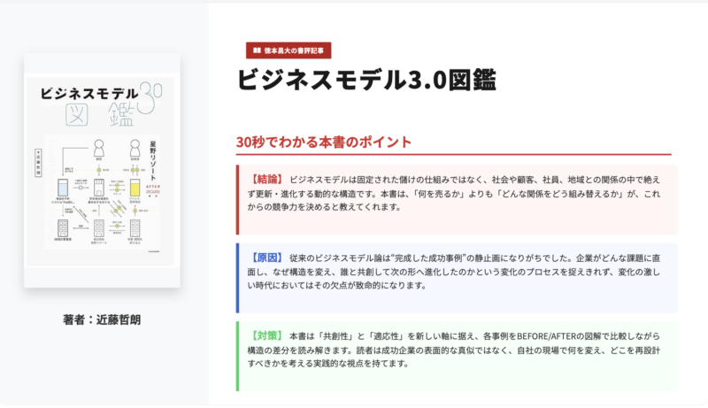 【結論】:ビジネスモデルは、固定された儲けの仕組みではありません。社会や顧客、社員、地域との関係の中で、絶えず更新され、進化し続ける動的な構造として捉えるべきです。つまり本書は、「何を売るか」よりも「どんな関係をどう組み替えるか」が、これからの競争力を決めると教えてくれます。