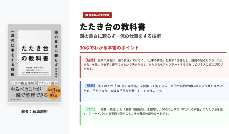 しかし、たたき台の教科書: 頭の良さに頼らず一流の仕事をする技術の著者の萩原雅裕氏が示すのは、問題の本質は個人の才能不足ではなく、目的・前提・論点・成果物が整理されていないことにあるという視点です。この転換は非常に重要です。